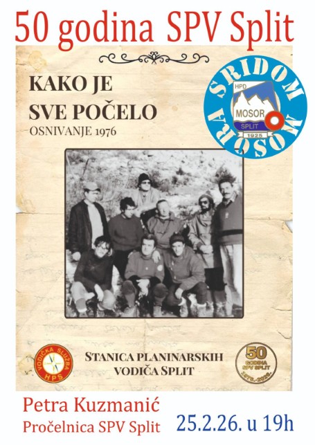 SRIDOM U MOSORA U 2026. godini Stanica planinarskih vodiča Split slavi 50 godina osnivanja stanice. Kroz interaktivno predavanje pročelnica Petra Kuzmanić će uz pomoć iskusnih članova stanice vodiča približiti povijest,…
