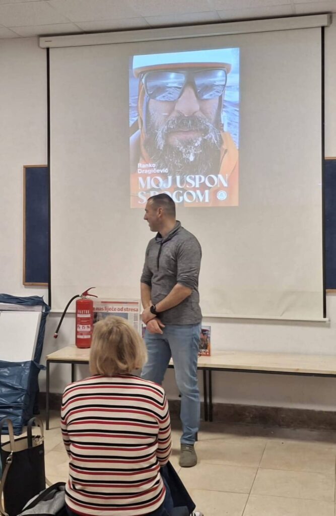 U srijedu 11.03.2026. g. imali smo priliku poslušati zaista velikog humanitarca, planinara i visokogorca Ranka Dragičevića. On nam je nakon uvodnog predstavljanja prikazao dokumentarni film u režiji Brune Mustića “Srcem kroz planine-Ekspedicija Denali”. U filmu nam je vrlo iskreno i realno ispričao o svom plemenitom motivu koji ga je tjerao da se uputi na ovaj surov i zahtjevan uspon, o osjećajima i tegobama koje su ga cijelim putem pratile, kao i o žrtvi koju je morao podnijeti on i njegova obitelj da bi se realizirala ova zahtjevna ekpedicija i da bi ostvario humanitarni cilj koji je zacrtao. Ranko je, zajedno sa svojim prijateljem Davorom Večajem, svoju dugogodišnju želju da popenje Denali, najviši planinski vrh sjevernoameričkog kontinenta, visok 6194 m, zapravo pretvorio u veliku humanitarnu akciju u kojoj je uspjevši popeti vrh prikupio iznos od 30.000,00 Eur i donirao ga za potrebe supetarskog Doma zdravlja. Sve dojmove o ovom njegovom putu, o vjeri koja mu je dala hrabrost, snagu i volju da se sretno vrati svojoj obitelji i da ostvari svoje plemenite namjere Ranko je zapisao u knjizi “Moj uspon s Bogom” koju nam je predstavio.